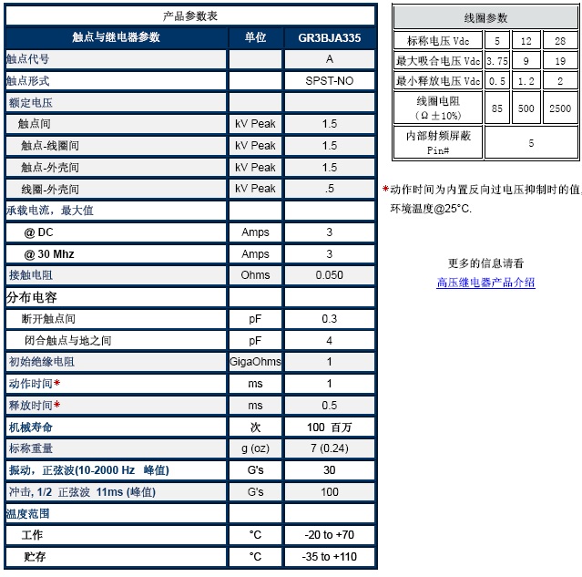 干簧继电器 您现在的位置:首页 >> 产品介绍 >> 单刀单掷继电器GR3BJA335
