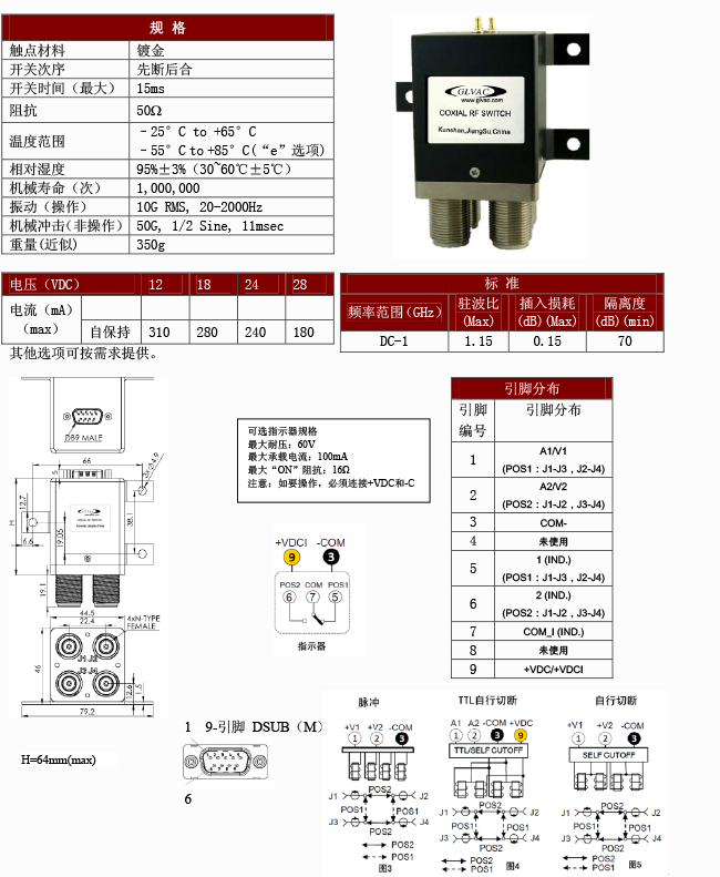 射频同轴继电器也称之为微波同轴继电器,它是由同轴高频接头作为射频引出端的射频继电器,由于同轴高频接头传输的微波信号具有频率高、频带宽、信息量大的特点,所以射频同轴继电器广泛应用于航海、通信、科技等领域的多路通信、中继通信、散射通信、移动通信、卫星通信、雷达系统、导航系统、电子对抗、测量检测等系统中。
