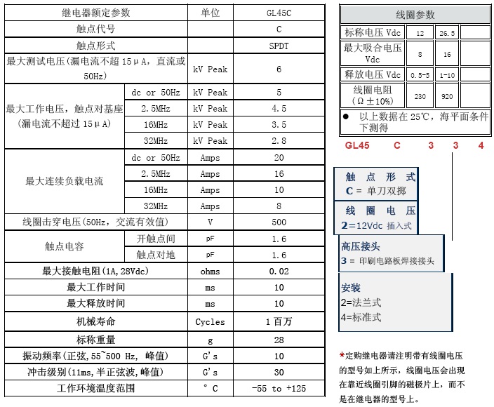 5kV单刀双掷的最小即使接上导线体积也是最小的;继电器额定电流下可作射频继电器真空介质,用于开关低电流负载,线圈功耗低,可直接替换KILOVAC的K45C真空继电器,可替换JENNINGS的RF60、RF61、RF64高压继电器。