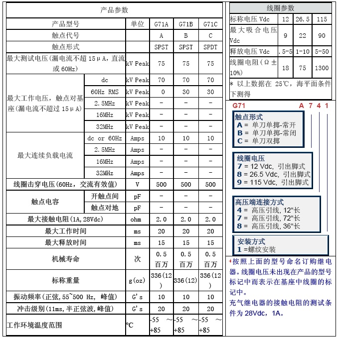 G71A、G71B在约6.3立方英寸的体积(100立方厘米)下封装,耐压达到70KV,使你的系统体积最小。 充SF6气体,用于电容器放电,无X射线。 镀锡耐高压引线设计,方便连接。 无操作弹跳。 可以直接替换KILOVAC的K71A、K71B高压继电器。 G71LC 性能与G71A、G71B一样。 单刀双掷用于极性转换或电源接通。 可以直接替换KILOVAC的K71C高压继电器。