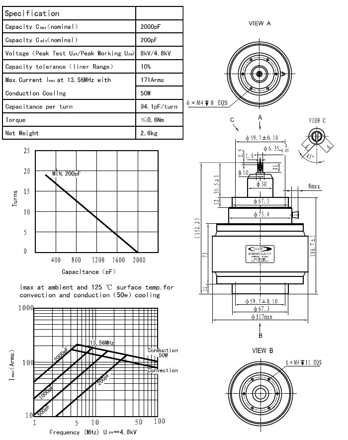 CKTB2000/5.6/171可变陶瓷高压真空电容器采用陶瓷外壳、真空介质、具有耐压高、体积小、Q值高、性能稳定可靠、价格低廉等特点,广泛用于感应加热、介质加热、通讯、广播等设备。