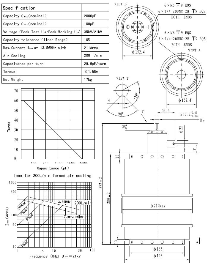 CKTBF2000/24/211可变陶瓷高压真空电容器采用陶瓷外壳、真空介质、具有耐压高、体积小、Q值高、性能稳定可靠、价格低廉等特点,广泛用于感应加热、介质加热、通讯、广播等设备。