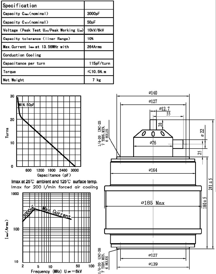 CKTB3000/7/264可变陶瓷高压真空电容器采用陶瓷外壳、真空介质、具有耐压高、体积小、Q值高、性能稳定可靠、价格低廉等特点,广泛用于感应加热、介质加热、通讯、广播等设备。