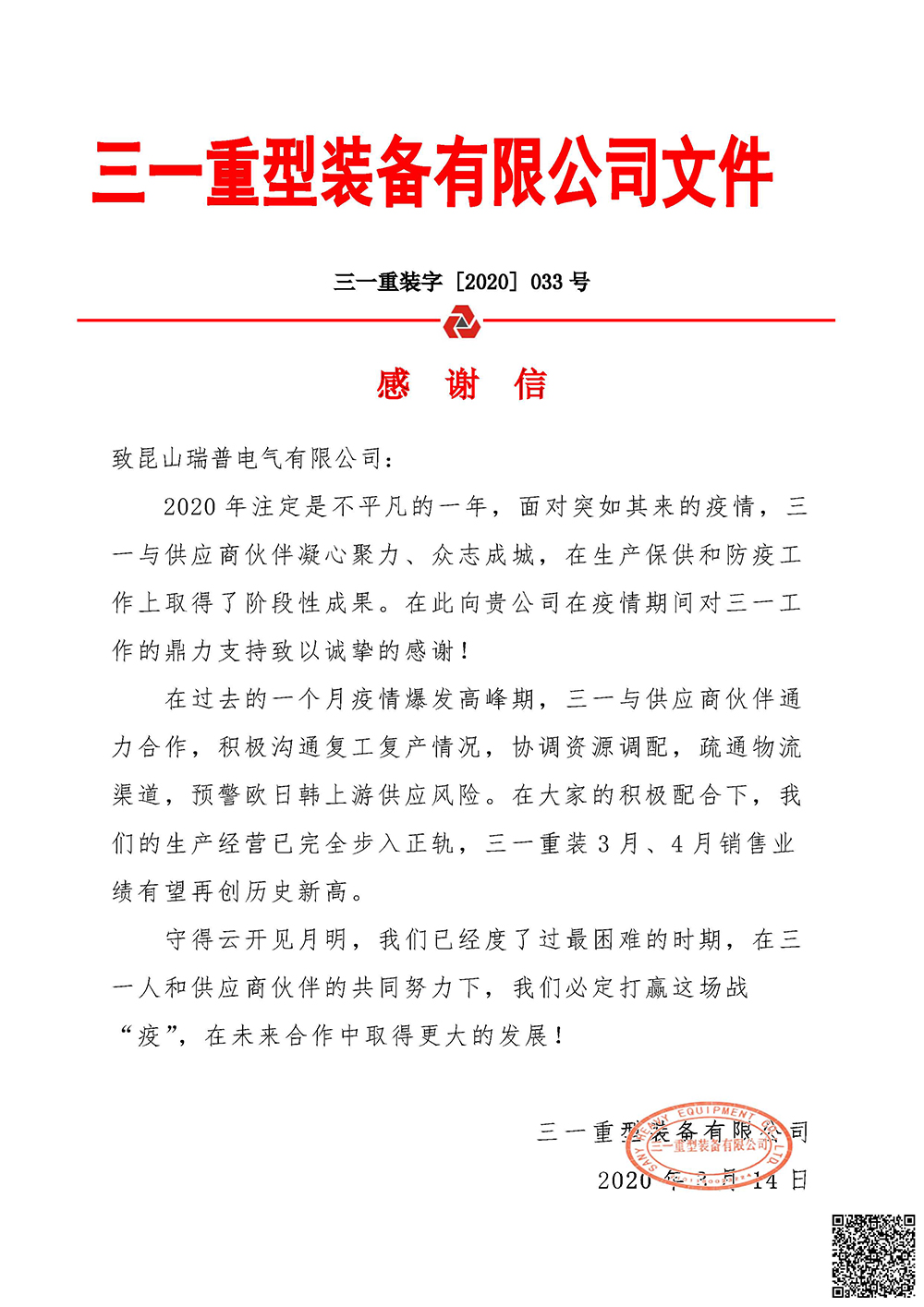 “2020年注定是不平凡的一年,面对突如其来的疫情,三一与供应商伙伴凝心聚力、众志成城,在生产保供和防疫工作上取得了阶段性成果。在此向贵公司在疫情期间对三一工作的鼎力支持致以诚挚的感谢!”。感谢信的背后,是昆山瑞普电气有限公司疫情防控和生产经营两手转、两不误,想兄弟单位之所想,急兄弟单位之所急。